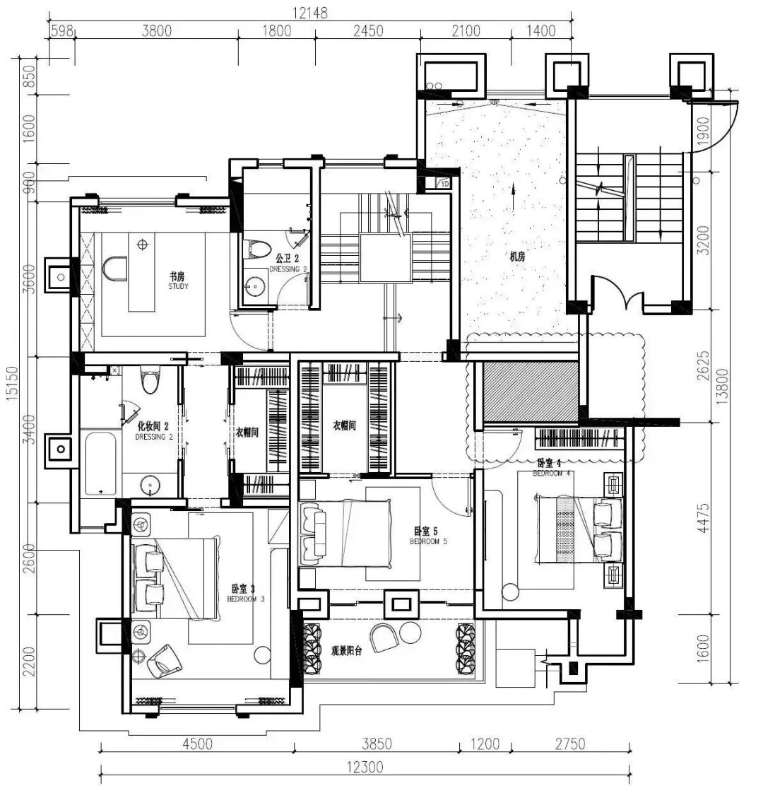 二层原有的空间布局是两个分开的卧室带一个露台,设计师将两个卧室及中间的主卫连通,形成一个大套房,并加入了书房和独立衣帽间,可以作为屋主人的婚房使用。同时将原来的二层露台改成两个客卧,方便男主人两位姐姐回家探望。