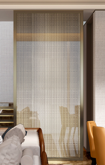 位于玄关处的通高布纹夹丝玻璃屏风与空间形成有机碰撞,并将空间的层次进行了拓展,夹丝玻璃若隐若现的特质让简约时尚中又带有一丝朦胧的韵味。