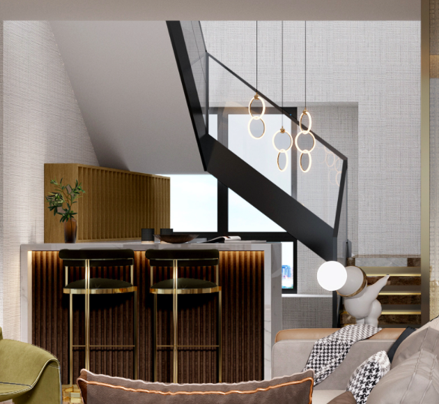 意式轻奢感的深色磨砂不锈钢金属元素起着局部点缀的作用,主要运用在吧台、楼梯扶手、墙面细节线条的勾勒以及电视机壁龛收口处,凸显灵动层次。