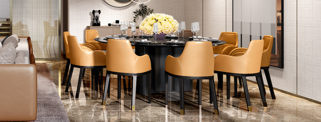 在软装布置上,客餐厅占据面积较大的沙发和餐桌也起到了画龙点睛的作用。建议采用皮质和布艺搭配的沙发以及深色石材圆桌,圆桌自古以来就有着团圆的寓意。