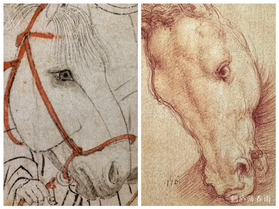 西画素描普及性强,许多画家都能轻而易举的达到扎实的造型能力,多数都能画得像,画得准。中国画在写实绘画上也能做到“对境取影”、“妙得神情”、“下笔成真”,如李公麟《五马图》就是很好的例子,每匹马的特征明确,人物概括洗练,形貌各异,在形神兼备的前提下,线条优美松驰,严谨舒展的形结合笔精墨妙的线,每个人物的细节特点交代到位,面部勾线后用淡墨稍加皴擦点染,这种造形扎实类似西方手法的白描技法的确与早期文艺复兴大师们的素描、速写颇为接近,此种画法在李公麟后,乏有人继,我国古代能做到形神兼备且有艺术性的画家也大有人在,但后期画家受文人画影响不重形,讲三庭五眼的程式和教条致使千人一面,范缜云:“形存则神在,形谢则神灭”。