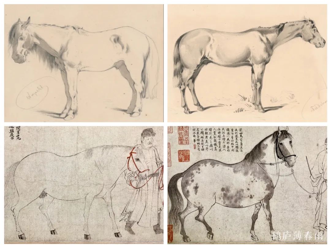 我国绘画上最早中西融合者首推清初意大利来华的传教士郎世宁,郎世宁来华正值西方17世纪巴洛克时期,他把小笔头勾染与写实油画技法融合;之后是徐悲鸿、蒋兆和把大笔头水墨同西方素描、速写技法融合。齐白石、任伯年的肖像画没有西画底子也形神兼备。
