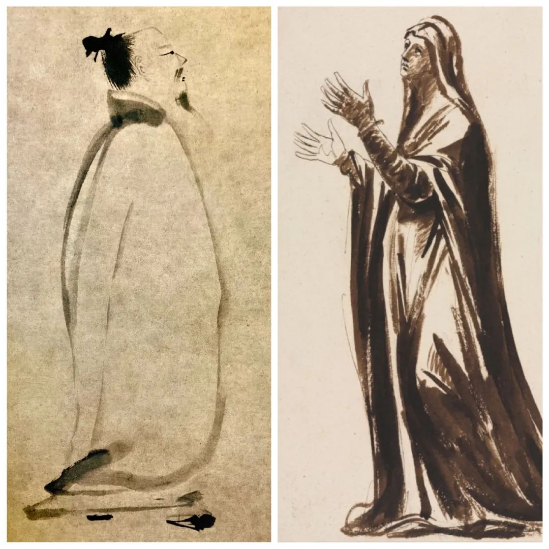 对比明清“传神写照”的肖像画和同时代西方的人物画像,不难发现素描在形准后重明暗的体积感和真实性;白描在形神兼备的基础上重书写性和线条美,中国画白描的线条有画意,线的提按、粗细也能表现空间,线的疏密、聚散也能表现体积,西方素描在形准的同时神韵亦存,东方在形备后也能出神入化,故西方写实为主,东方写意为主。写实也可写意,就如同画工笔和写意一样,没有矛盾。先工后写,能工能写;先收后放,能收能放。研究古代艺术家不是记住他们的名字,而是要看透、弄懂他们之所以成功背后的普遍道理和经验,西画有其长也有其短,我们要两者各取其长避其短,倘能既会素描又会白描,两者之间自由转换和熟练运用在画上,他们的形准,我们的神妙,皆为我所用,可中,可西,或偏中,偏西,都能运用自如,自由切换,这就要求我们要学贯中西,道通古今,勤学苦练,方能学以致用。