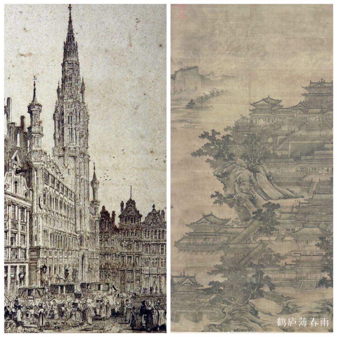 以建筑为例,西方人运用焦点透视法画建筑前往往要计算好,测量准,方才下笔,画出来的建筑如同工程测绘图一样,虽有透视感、空间感但缺少艺术性。中国画的建筑称之为“界画”,也有微妙的透视,但更注重整体的和谐和建筑物的气派,线条合法度准绳,层楼叠榭,鳞次栉比,楼阁台榭望之中虚,可游可居。