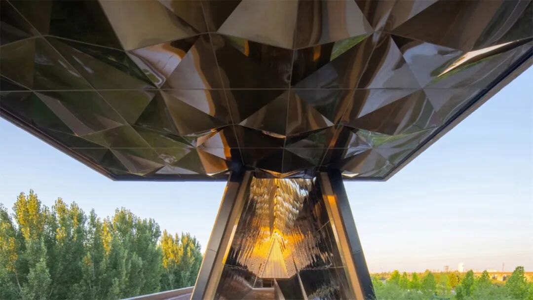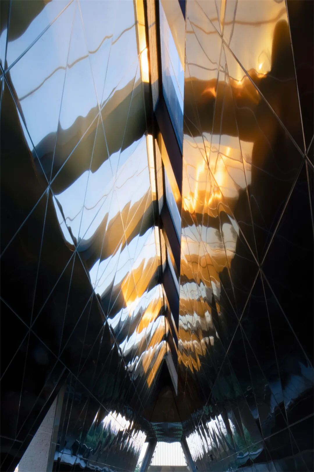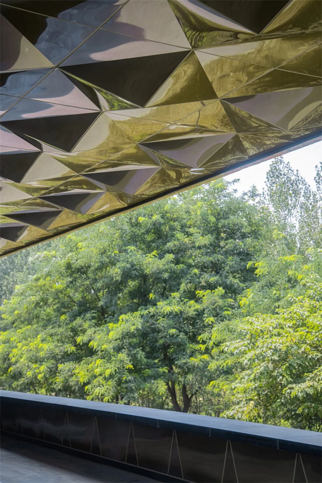 简约异质的造型在生态区极具标志感,自成风景。建筑外表皮采用夯土纹理板,呼应当地风土文脉和具历史质感的建筑肌理。内表皮则以不锈钢铜板为面,一则保持与夯土的统一色调,二则以这一现代的材料作为空间感知上的反差强调人们对现代身份的认同,三则藉其金属的光泽,和光对话,将景观影入内部,以“波光涟漪”呼应渭水东流和风中幻景。内表皮统一的铜板随着屋檐伸出,虚化建筑的内外界面,消融古今沧桑。