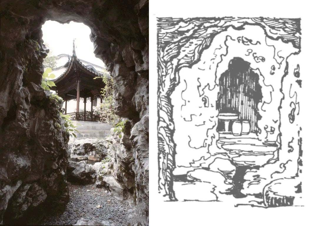 显然,张伦宅院中的景阳山并没有拘泥于对真山的模仿与照搬,而是将原有的自然景象进行概括凝练,并融入文化因素与造园者自己心中对山水的理解,这无疑是园林审美史上的一大进步。这一点来后来的叠山中被发扬光大,其中戈裕良作品环秀山庄假山就是在有限的空间中将自然山脉不同的空间关系穿插其间,让人行走其间柳暗花明。