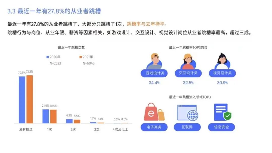 腾讯发布《2021中国用户体验行业互联网新兴设计人才白皮书》里提到,近一年交互设计类跳槽率占用户体验行业的 32.5 %,稳居第二。