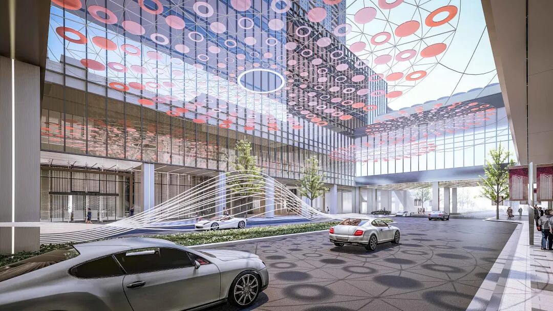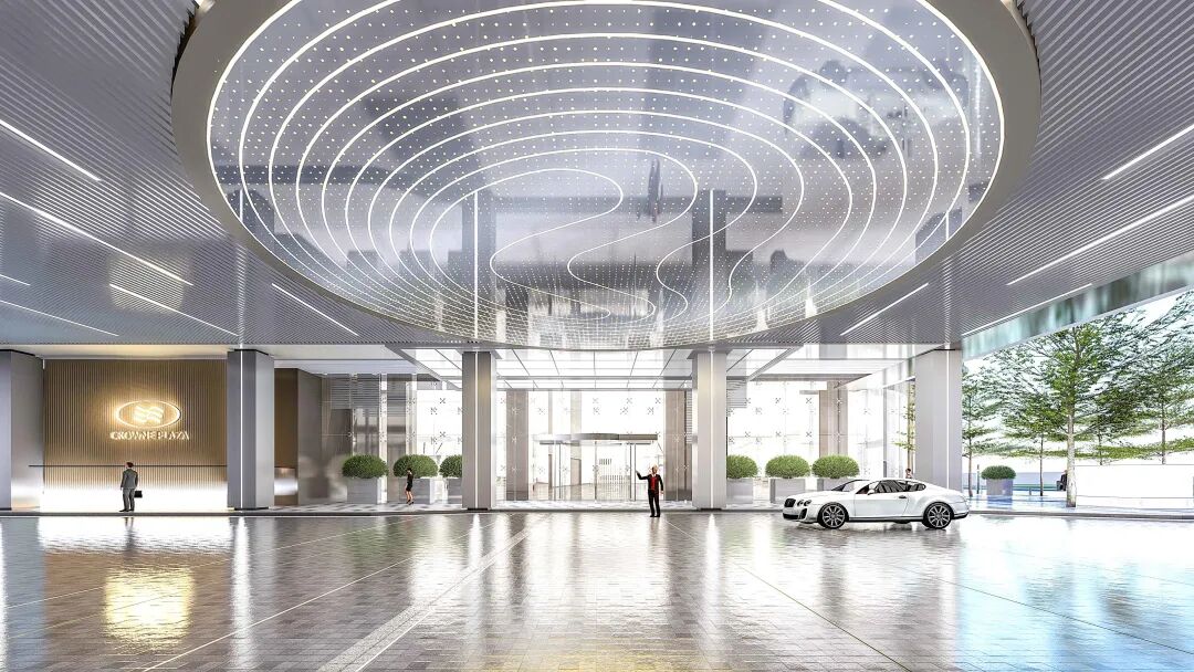 优化处理非机动车车库,结合水景、logo设计皇冠假日酒店迎宾界面,增加场地辨识度,提升酒店品质形象。