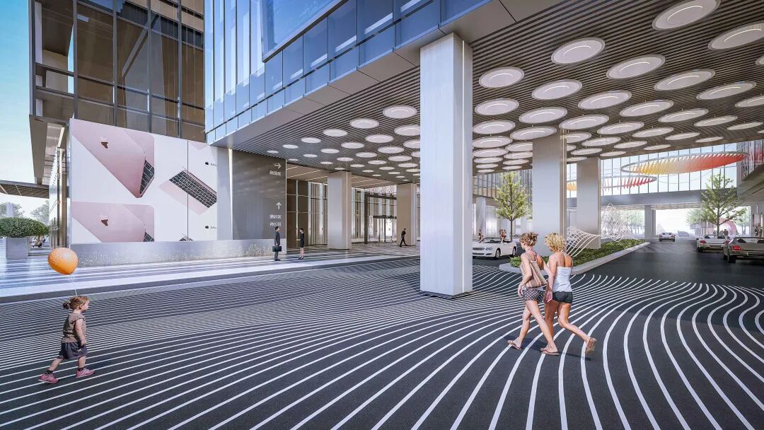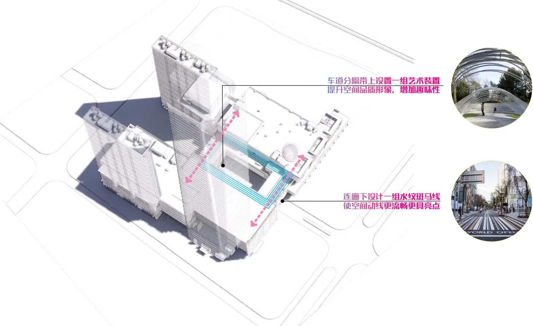 对建筑连廊底部空间进行优化改造,通过拆除花池坐凳、高层灌木等不利因素,增加水纹斑马线、光环互动装置及“钱塘观潮”艺术装置等景观亮点,构建一个南北地块连续流动的步行体验空间。