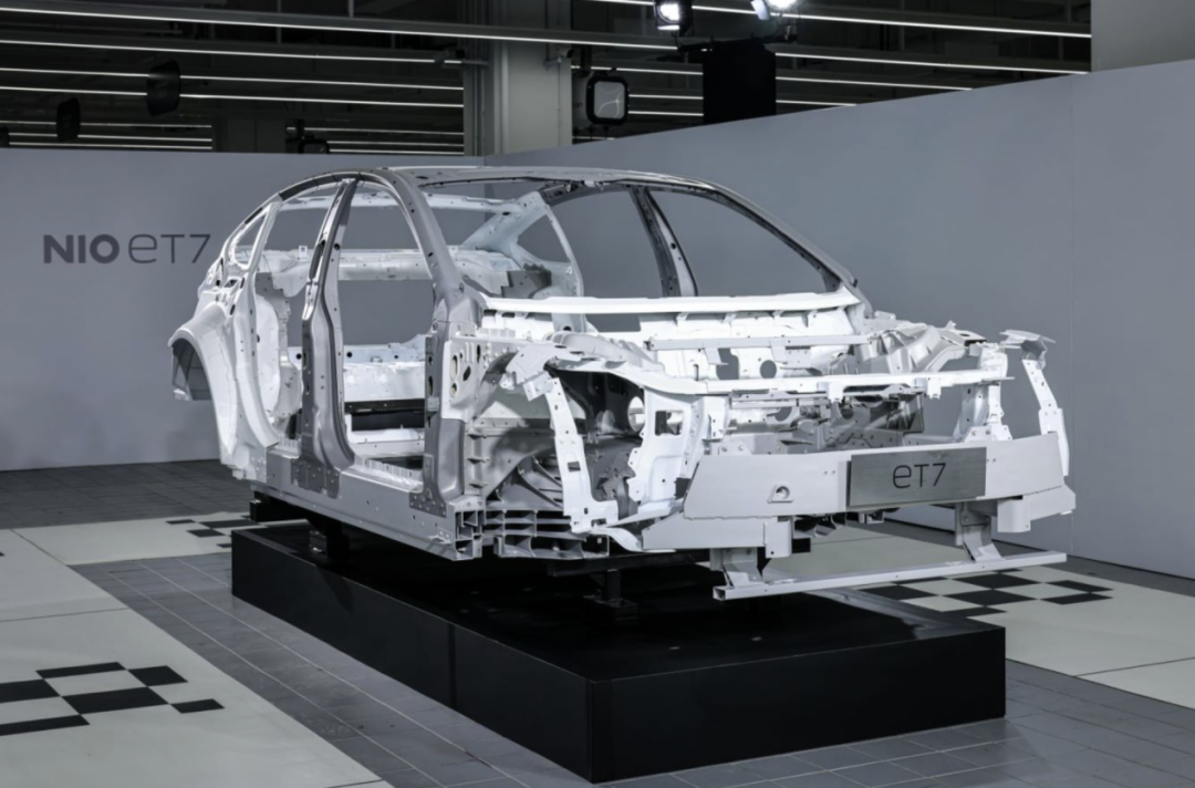 ET7定位是一台豪华纯电中大型轿车,整备质量约2.3吨,钢铝混合结构的白车身总重近420kg,占车重约6/1,包含了42%的铝以及57%的钢,还有1%是复合材料的后排座椅(底架)。