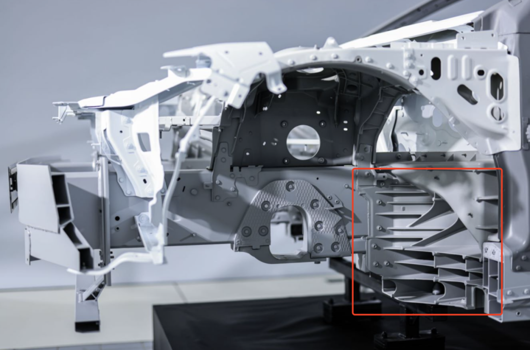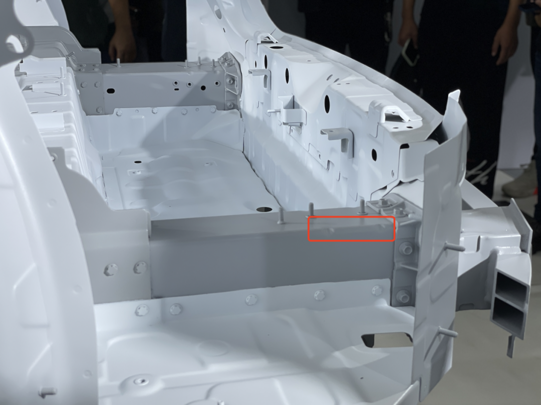 Torque box是一体铸造的结构,它的正前方连接前纵梁,后面衔接门槛梁、A柱下部结构以及下面的脚踏板位置,可以说是将车身正前方这四个关键传递路径牢牢的绑在一起。
