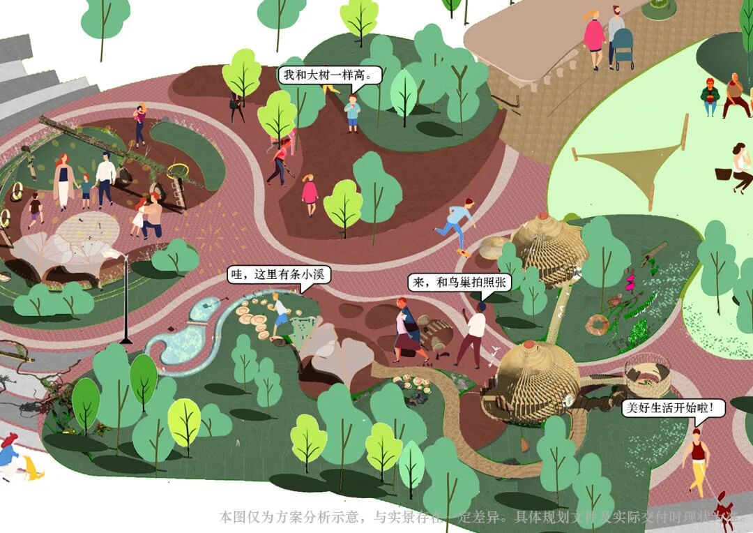 围合空间打造的雨林乐园,让孩子们在自然里攀爬、玩沙坑、钻洞,与小伙伴一起观察自然环境的变化;在松果营地里,亲子与自然的互动探索,不仅寓教于乐,更共享亲密时光。