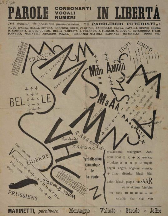1914年,随着马里内蒂出版《Zang Tumb Tumb》,未来派的排版革命达到高潮。其排版革命追求独特的未来派页面编排和书籍设计方法,在探索自由文字观念的过程中发展出独特的排版理论。他们在期刊、手册、宣言和书籍中不懈地进行着排版实践,游走于激进的现代主义风格与古典主义不朽的几何变构之间。