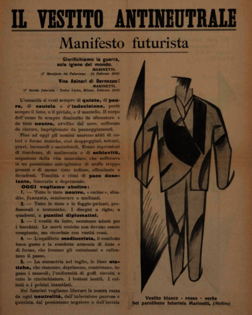 在马里内蒂的未来主义革命中,没有什么是一成不变的,更何况日常生活。“时空已死”——马里内蒂在他的《未来主义创立宣言》(1909)中写道。他不断扩大的运动探索了每一种可以想象的媒介,服装,戏剧,音乐,诗歌......其后人必然会转向对建成环境的重新构想。