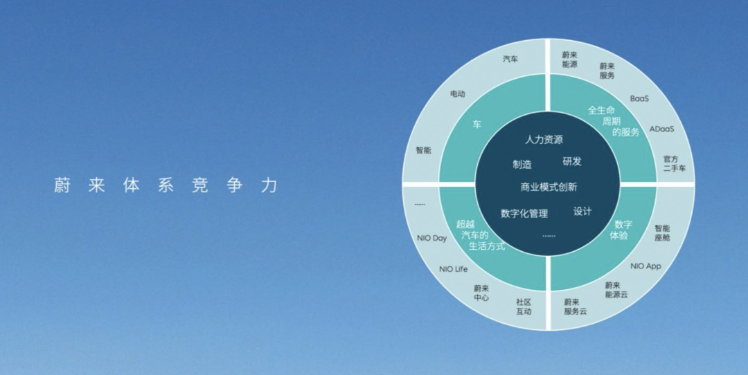 除了用一张6年前的PPT解释当下的行为,秦力洪还展示了一张蔚来体系竞争力的饼图,这张图则构建了一个模型框架,能够用来串联起蔚来所有动作的逻辑。