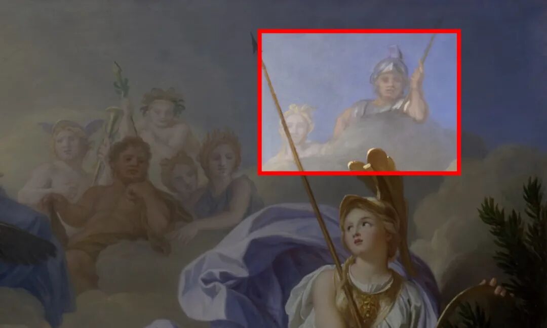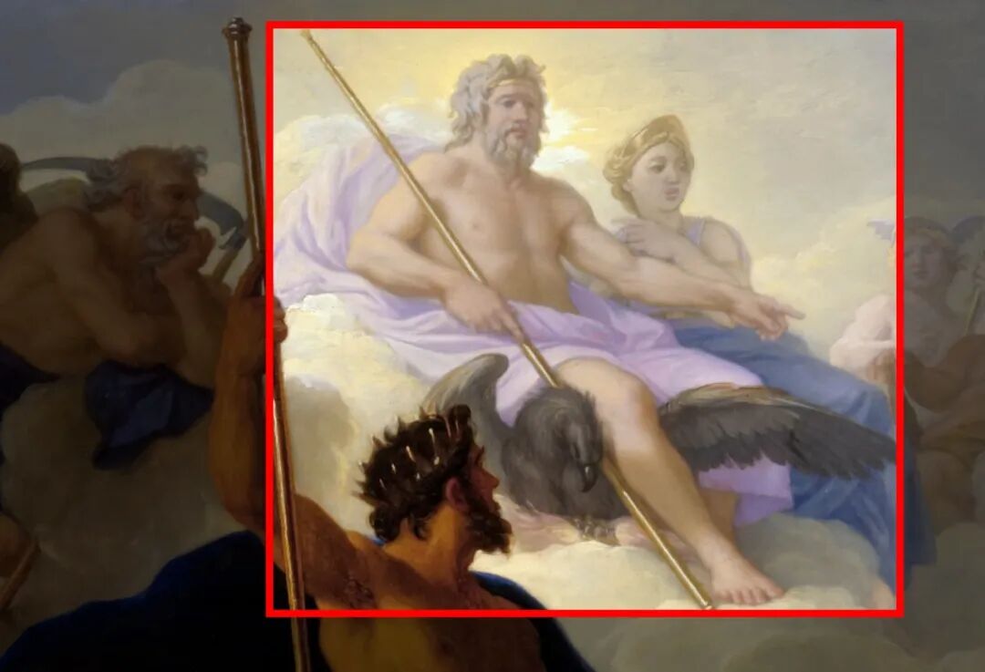 画中的人物,除了前景的手持长矛的雅典娜与手持三叉戟波塞冬外,后景的众神,中间端坐中央的自然是众神之王宙斯/Zeus与神后赫拉/Hera。而在宙斯右侧,头戴罗马头盔的勇士,无疑是战争与暴力阿瑞斯/Ares。