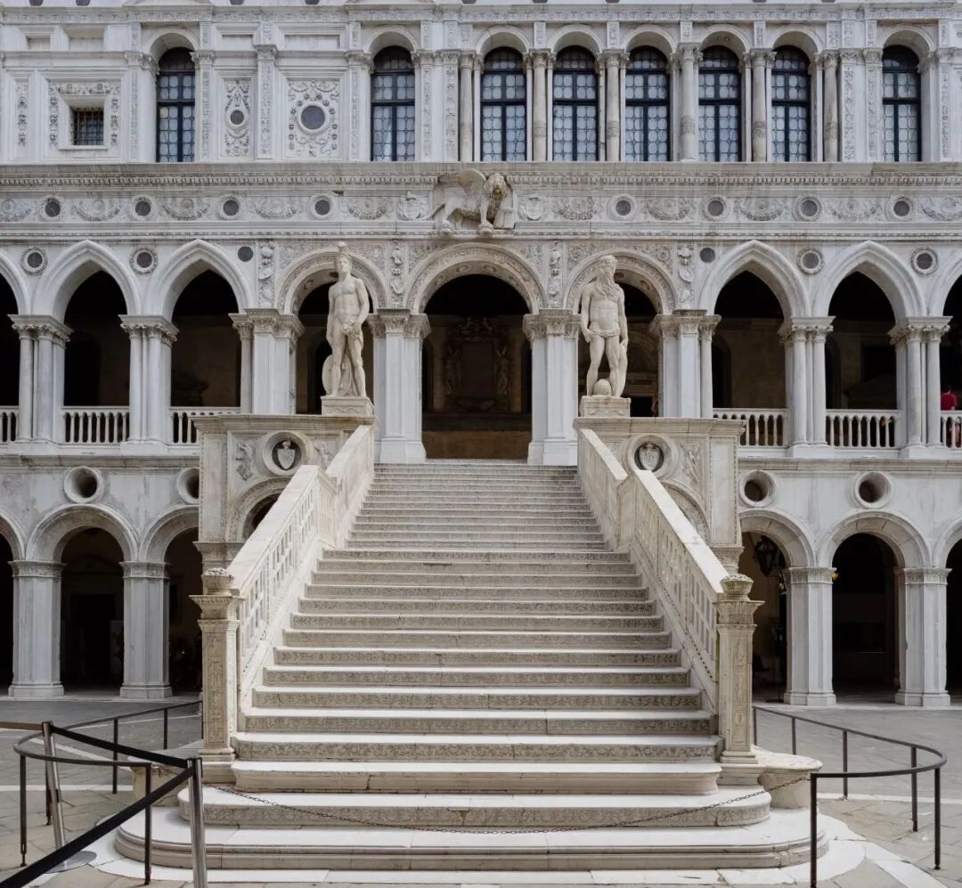 威尼斯总督宫/Palazzo Ducale,作为威尼斯共和国时代的总督官邸,它的中心入口处的巨人台阶/Scala dei Giganti,左右两侧分别就是战神阿瑞斯与海神波塞冬的雕像,上方是象征威尼斯的圣马可飞狮/St. mark's winged lion,他们共同构成威尼斯彼时在海洋与陆地间的霸权象征。