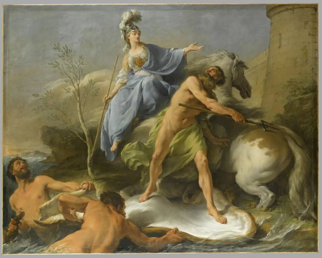 这幅画的画家同样来自法国,叫沙皮乌,它描绘的同样是雅典娜与波塞冬关于雅典守护神的身份争夺的战争。