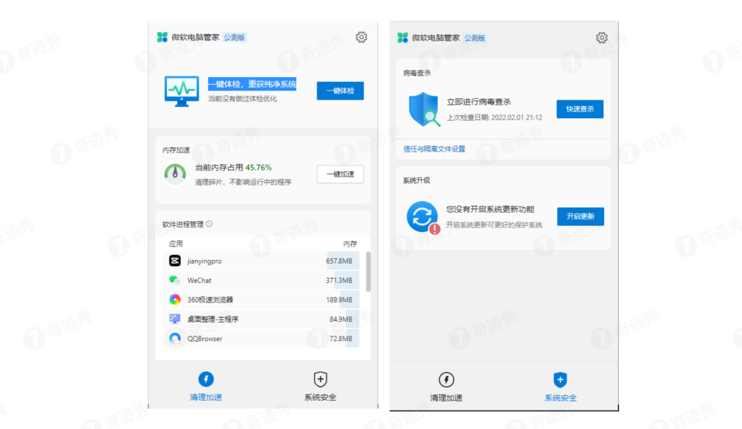 时隔4个月,微软电脑管家正式推出2.0公测版,更新后的版本更加强大,并且结合微软独有的Windows底层开发能力来优化电脑状态,电脑提速更加明显,和原来的1.0版本完全不同。