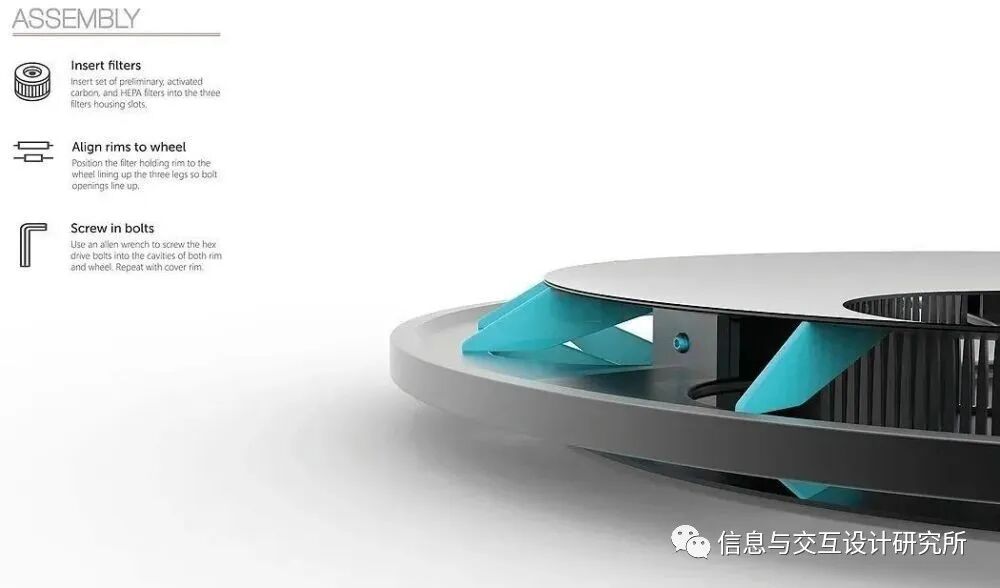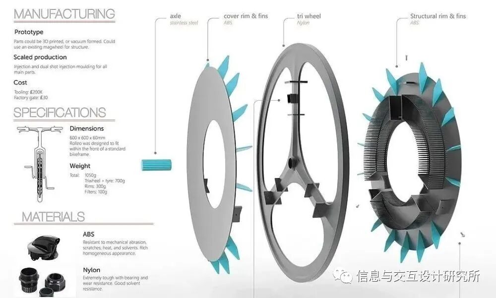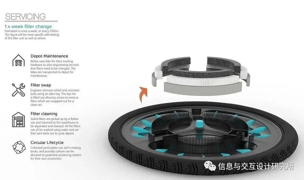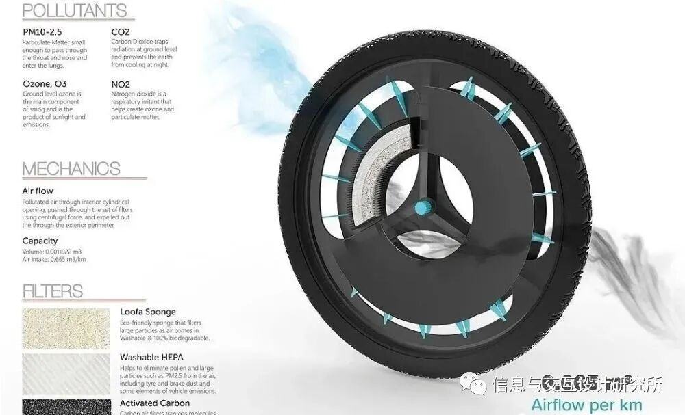 设计师将自行车的车轮变成空气污染捕获装置。该装置可以净化空气并将其释放到环境中。Kristen考虑了自行车车轮的旋转运动及其作为空气滤清器的使用,就像传统的家用空气滤清器在旋转运动中一样。该装置通过将装有过滤器的轮辋把污染的空气推入,然后把干净的空气推出来工作。
