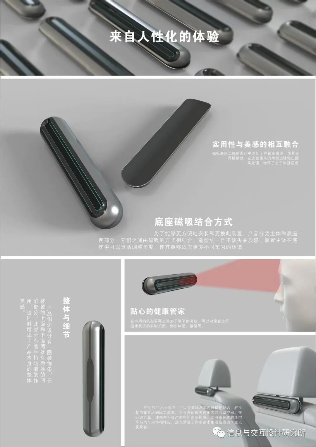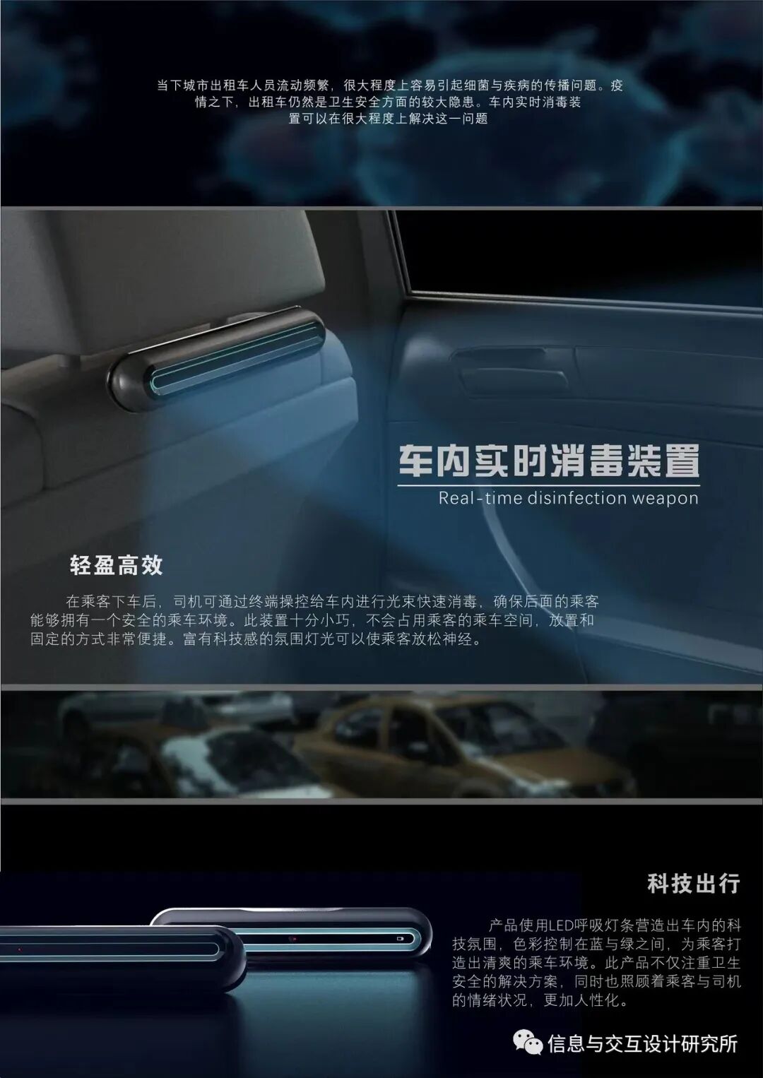 此产品是通过司机终端操控的方式为公共汽车乘客进行车内部实时消毒的智能装置。此款智能消毒装置结合了LED深紫外技术,可在几秒钟内完成消毒,在不占用乘客的乘坐空间的前提下对车内进行全面消毒,可以避免因为出租车巨大的人流量而造成的疫病传播。此装置放置在座椅头枕处和前排汽车空调旁边,可以实时监测到乘客的健康状况并反馈在司机终端处。消毒装置由主体和底座组成,与底座形成磁吸的放置方式,可以灵活安装和清洁。