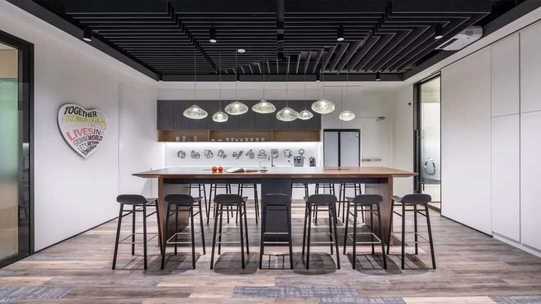 在了解Novozymes的企业文化与员工行为习惯时,我们得知这里的员工非常享受每天共同享有的午餐时光,因此最初在设计用餐区时,我们更希望这个空间能够将员工聚集在一起,兼具用餐、交流、办公等多种功能。通过用实木桌板作为高吧台台面来增加温馨触感,为员工营造轻松自如的“家”空间。