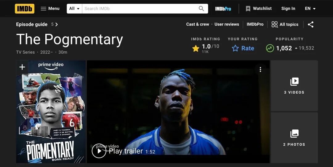 法国球星博格巴个人纪录片《The Pogmentary》从罕见的1.6评分跌至1.0/10,创下IMDb史上最差评分记录。