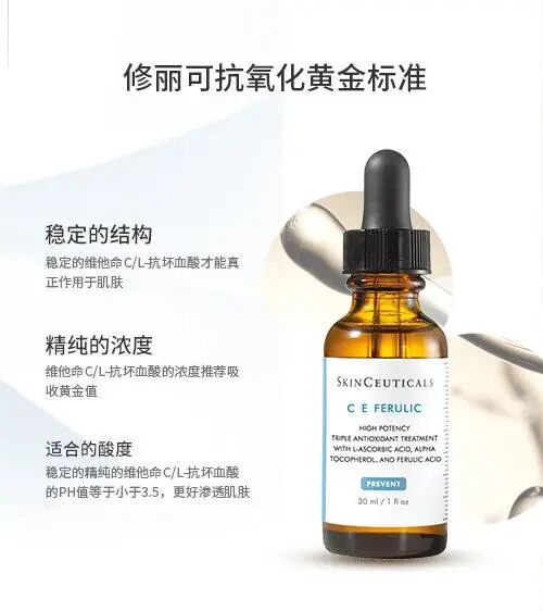 CE经典抗氧瓶的抗氧实力源自于修丽可30年来在抗氧赛道的权威研究成果,这项研究所确定的配方标准获得了“杜克抗氧化剂专利”,令维C实现稳定的透皮吸收。