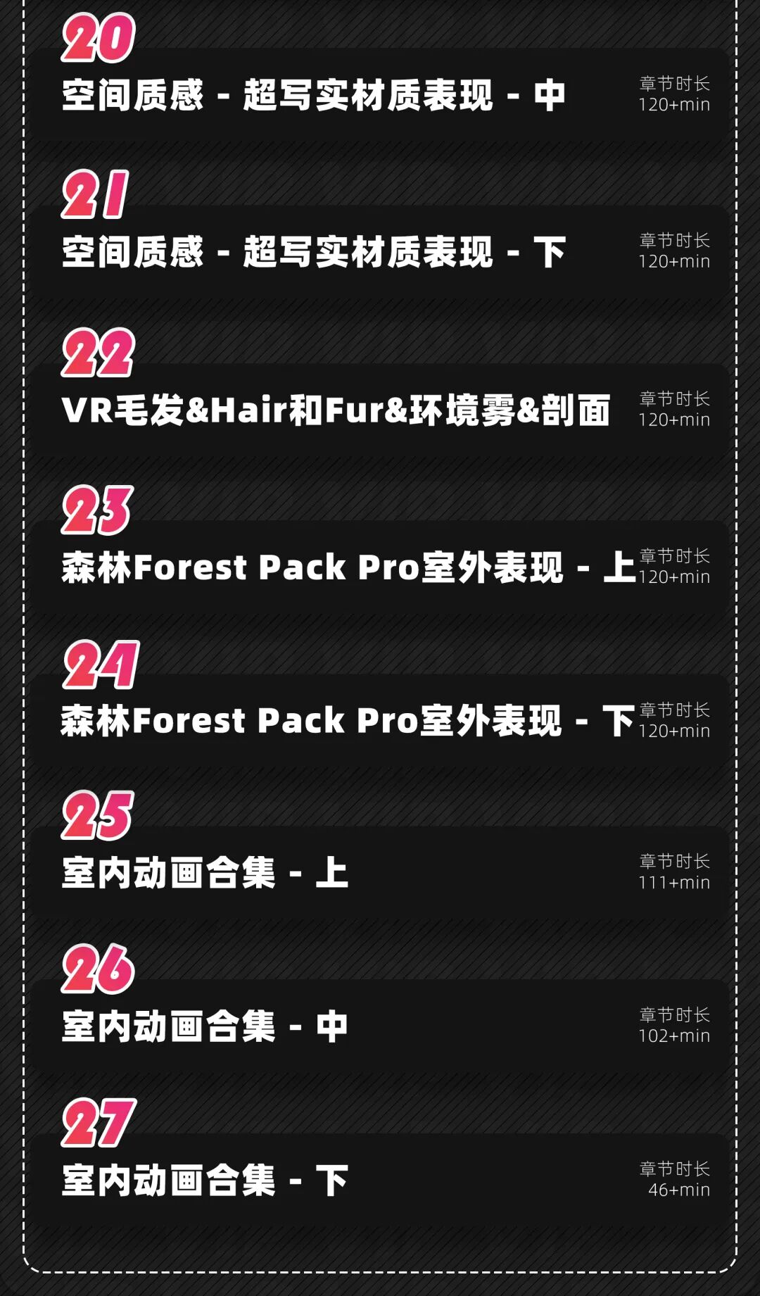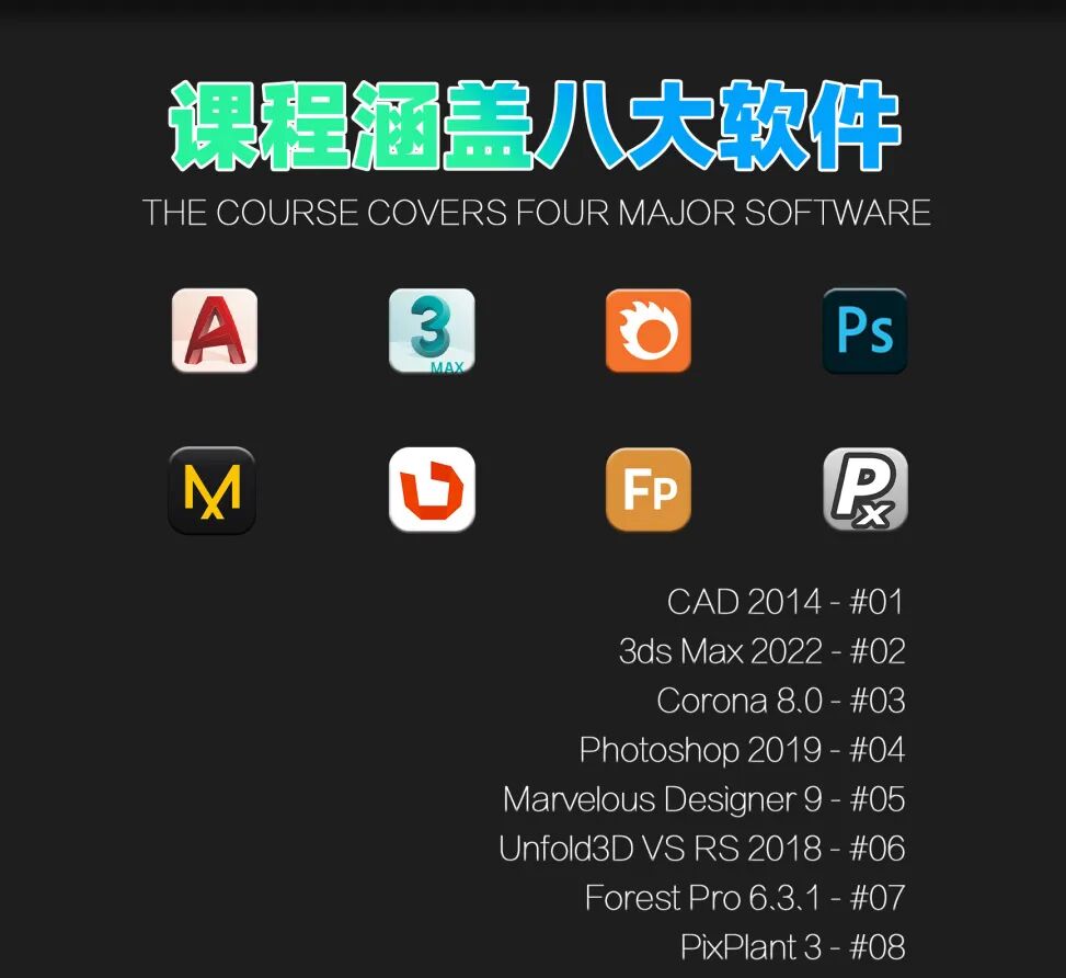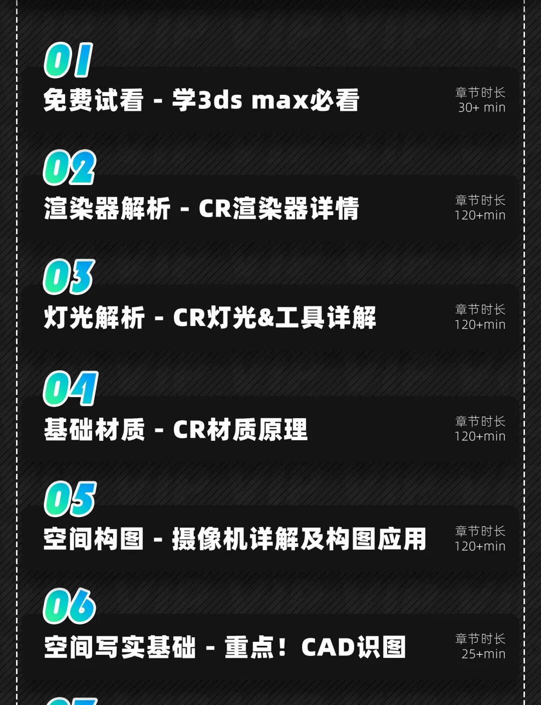 具体的咱们可以来看课程大纲安排,因为是3D分别搭配V-Ray、Corona的两套课程,所以我们把课程分成两套,你们可以针对自己喜欢用、感兴趣的软件来学习。