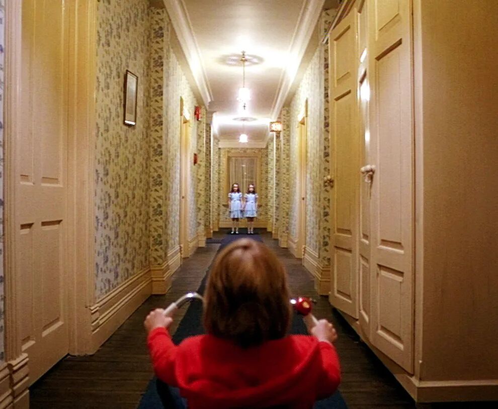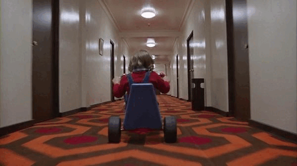 无法忘记的可能是《闪灵》中的瞭望酒店。以非人的视角跟随着丹尼的三轮小车,随着丹尼在每一个转角的选择中给观众带来了镜头的晕眩感和走廊的无尽感。无论从拍摄层面和空间层面上都展现出了走廊的恐怖氛围。