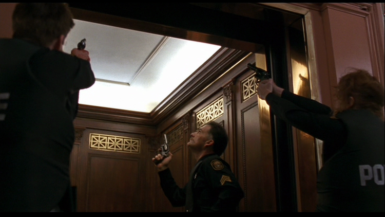 沉默的羔羊中当所有人都在寻找“失踪的嫌犯”汉尼拔时,运送伤员的电梯里突然掉下血滴。一道人形的阴影在电影顶若影若现,加上电梯狭小空间的窒息感,观众有谁不会紧捏一把汗呢。