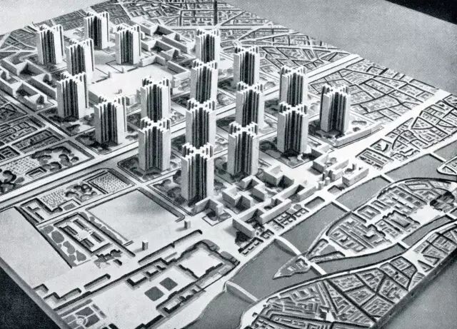 柯布西耶在1925年为巴黎作了一版城市规划,在规划图里,柯布西耶拆除了老旧的巴黎市中心,在空出来的近5平方公里内,均匀地布置十字形的摩天大厦,并建设超大马路供汽车通行。