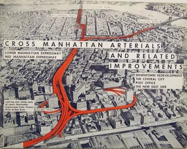 比如后来的曼哈顿下城高架路计划,准备修建一条十车道的巨型高速公路,一路割裂Soho区、小意大利区等纽约的重要街区,预计拆除416栋建筑。