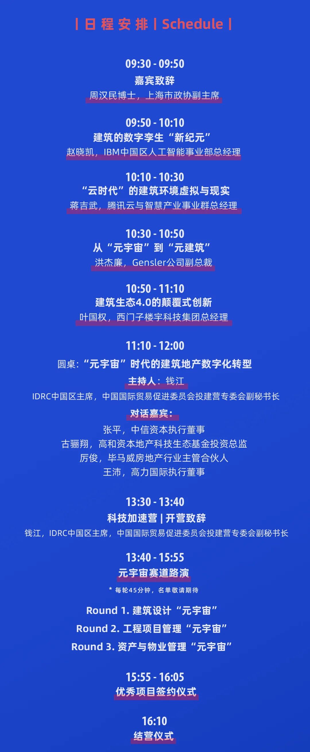 中建集团、高和资本、容亿资本、龙舟投资等优秀的地产与基建科技投资企业将入局带节奏。现场更有来自IBM、Microsoft、Autodesk、腾讯等世界500强企业的资深高管组成的专家导师团,现身搅动这波虚拟浪潮。
