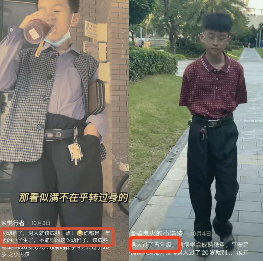 就这样,“20岁男人成熟穿搭”成为了近期互联网上被大家热议的大型迷惑行为。