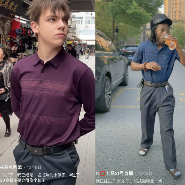 视频中,这些年轻人套上5、60岁男人最常穿的冰丝POLO衫,腰间挂着一串钥匙,双手背身后半握一个保温杯,举手投足间透出一股与自己年纪不相符的“成熟”气质。