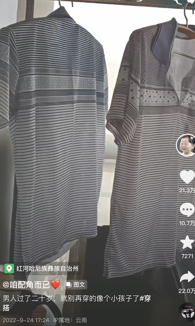 视频的拍摄者都会用罗大佑《你的样子》做背景音乐,并且统一配上一段“男人过了20岁就不要穿得像个孩子”的文案。