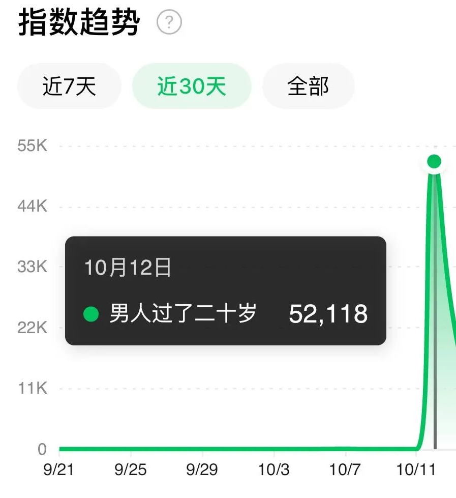 根据微信指数显示,关键词“男人过了20岁”从10月11日开始迅速攀升,数据最高的时刻,有超过5万人在线搜索。
