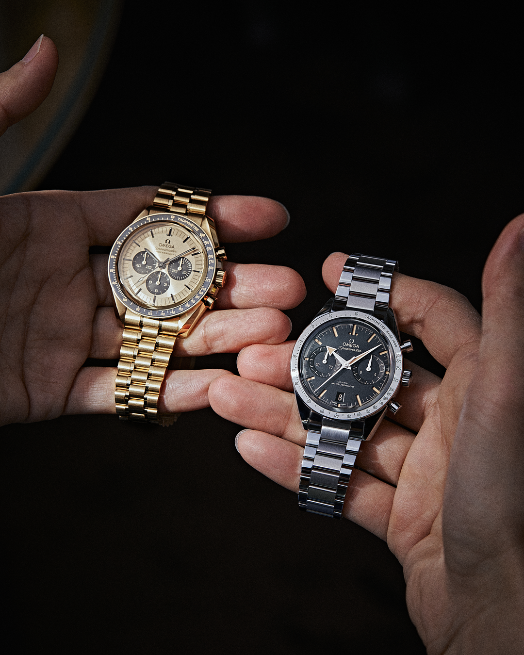 欧米茄超霸系列月球表Moonshine 18K金款与欧米茄超霸’57腕表,拍摄 © Chienyun