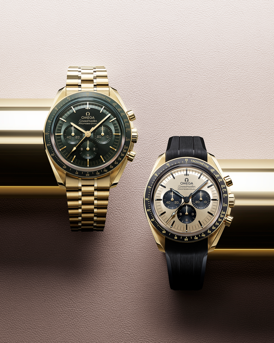 2022年,欧米茄终于将Moonshine 18K金用于量产,推出绿色表盘款和黑金“熊猫”款专业月球表。