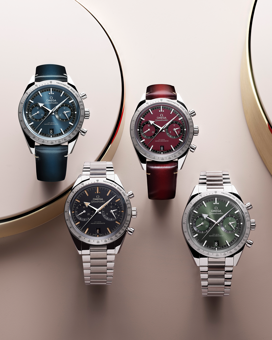 新品超霸’57腕表共推出八款,有四种表盘颜色可选,分别为黑、蓝、勃艮第红、绿色,表带有钢链和皮表带两种选择。