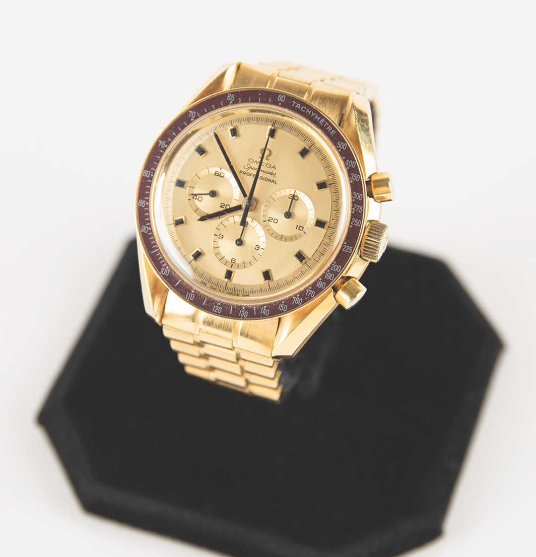 在当年庆祝登月成功的晚宴上,欧米茄捧出了一款黄色18K金限量超霸腕表:金色表盘,勃艮第红色铝制表圈,镀黑指针与时标,这是第一枚贵金属超霸。