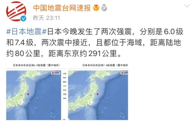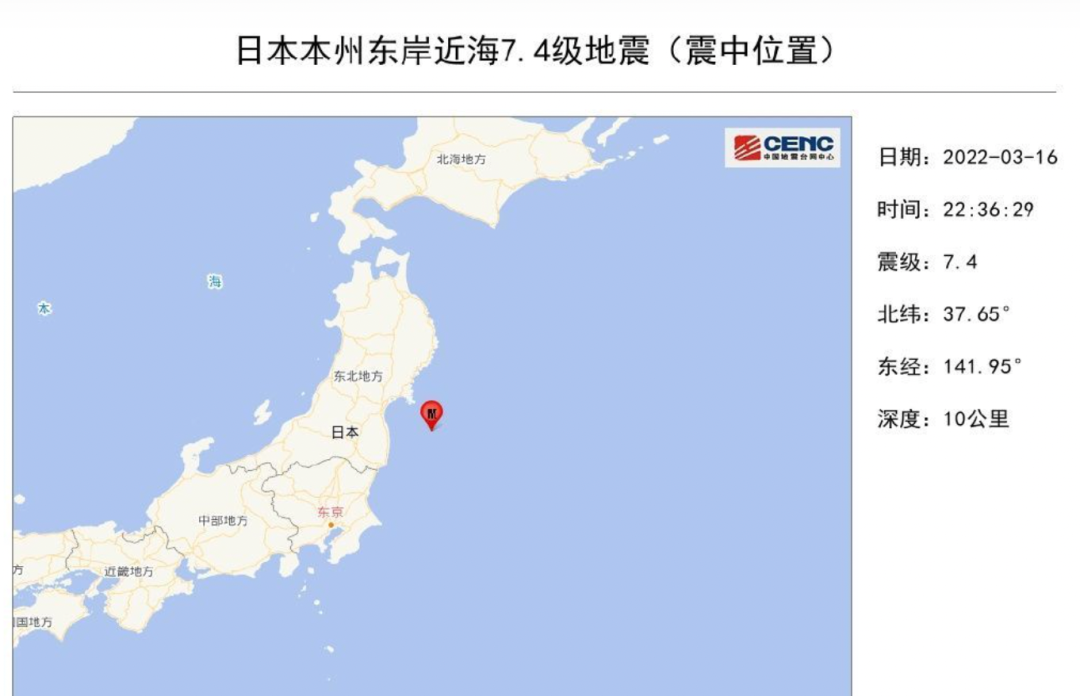 2022年3月16日日本又又又地震了,第一次发生在22点34分,在日本本州东岸近海发生了6级地震,震源深度10千米;第二次发生在23点37分的日本福岛县附近海域里式7.4级地震。