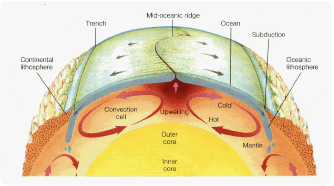 地壳以及地幔较冷、较坚硬的上层合称为岩石圈,板块也是在这个区域形成的。岩石圈以下是黏度较低的软流圈,岩石圈就在软流圈上方滑动。