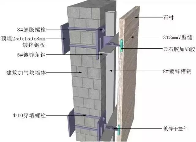 在钢骨架上插固定螺栓,镶不锈钢或铝合金固定挂件。用胶剂嵌入下层石材的上槽,插连接挂件,嵌上层石材下槽。