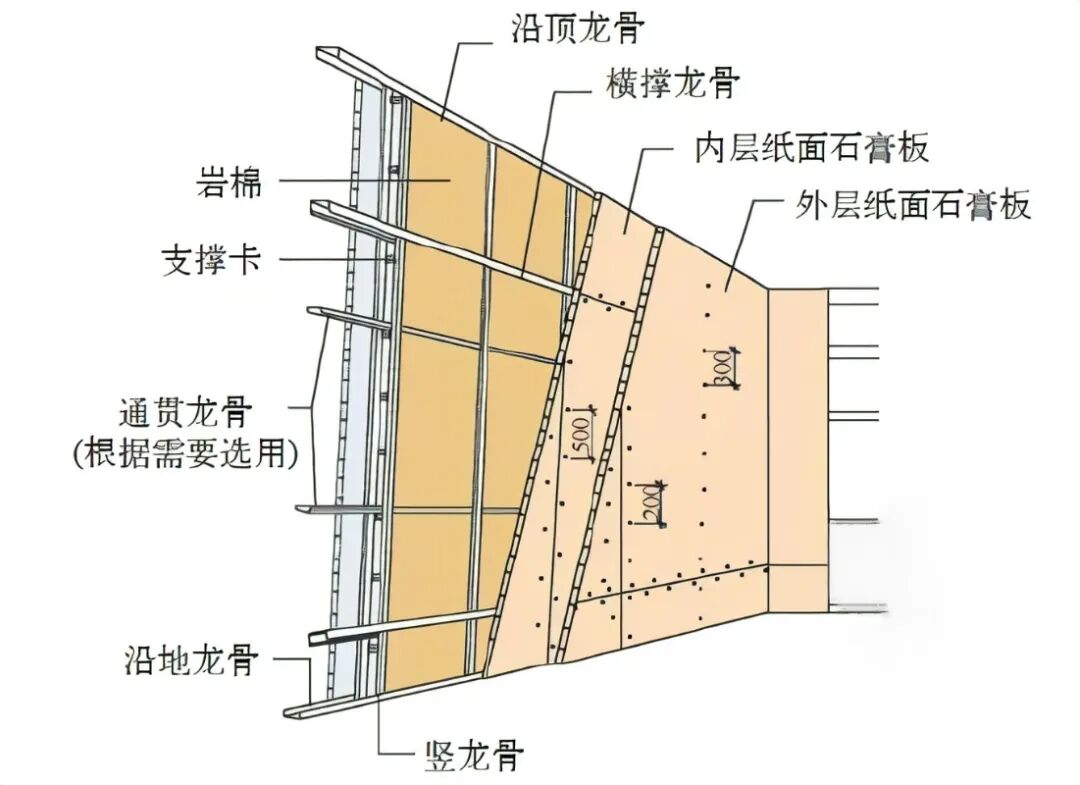 主要组成材料有沿顶龙骨、沿地龙骨、加强龙骨、竖向龙骨、横向龙骨、支撑卡、卡托、角托、连接件、固定件、附墙龙骨、压条、射钉、膨胀螺栓、镀锌自攻螺、纸面石膏板等。