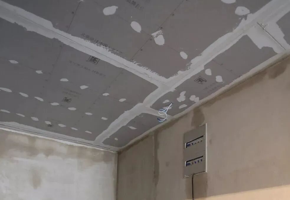 在石膏板的面层上进行批刮腻子。批刮腻子时,先批刮底部腻子,简单的进行一个封闭找平。然后所有底层腻子完成以后再来批刮面层的腻子。