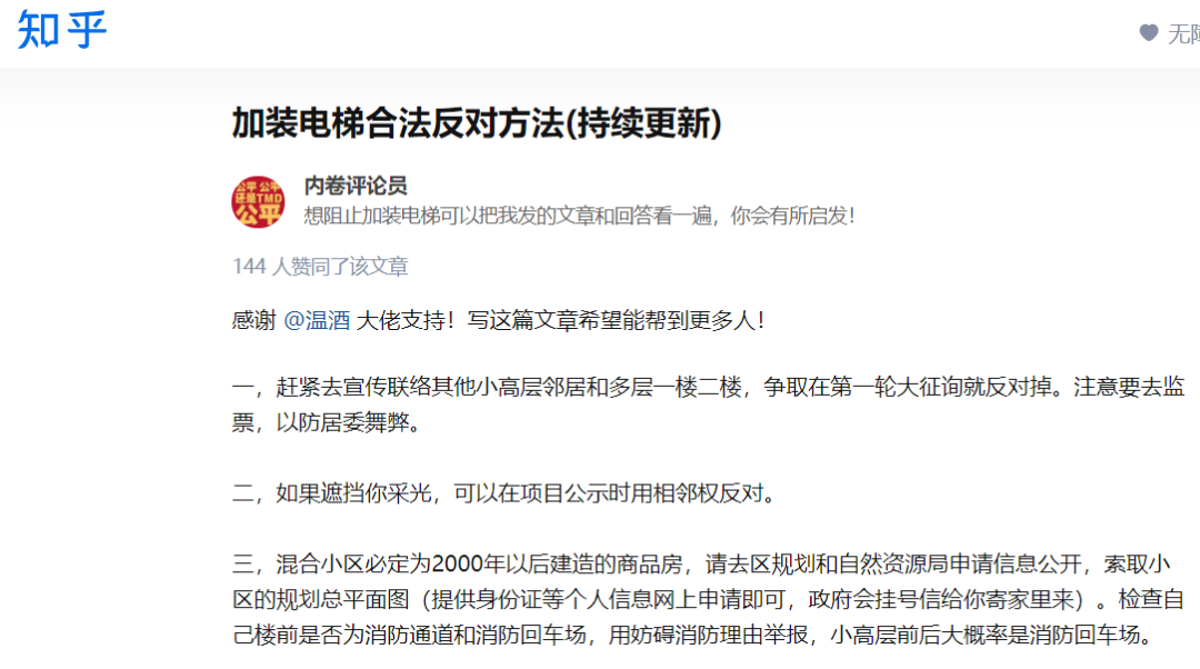 不管是在知乎上还是在篱笆上都有帖子甚至是合集,反对加装电梯的人数和方法还真不少。(如下图)