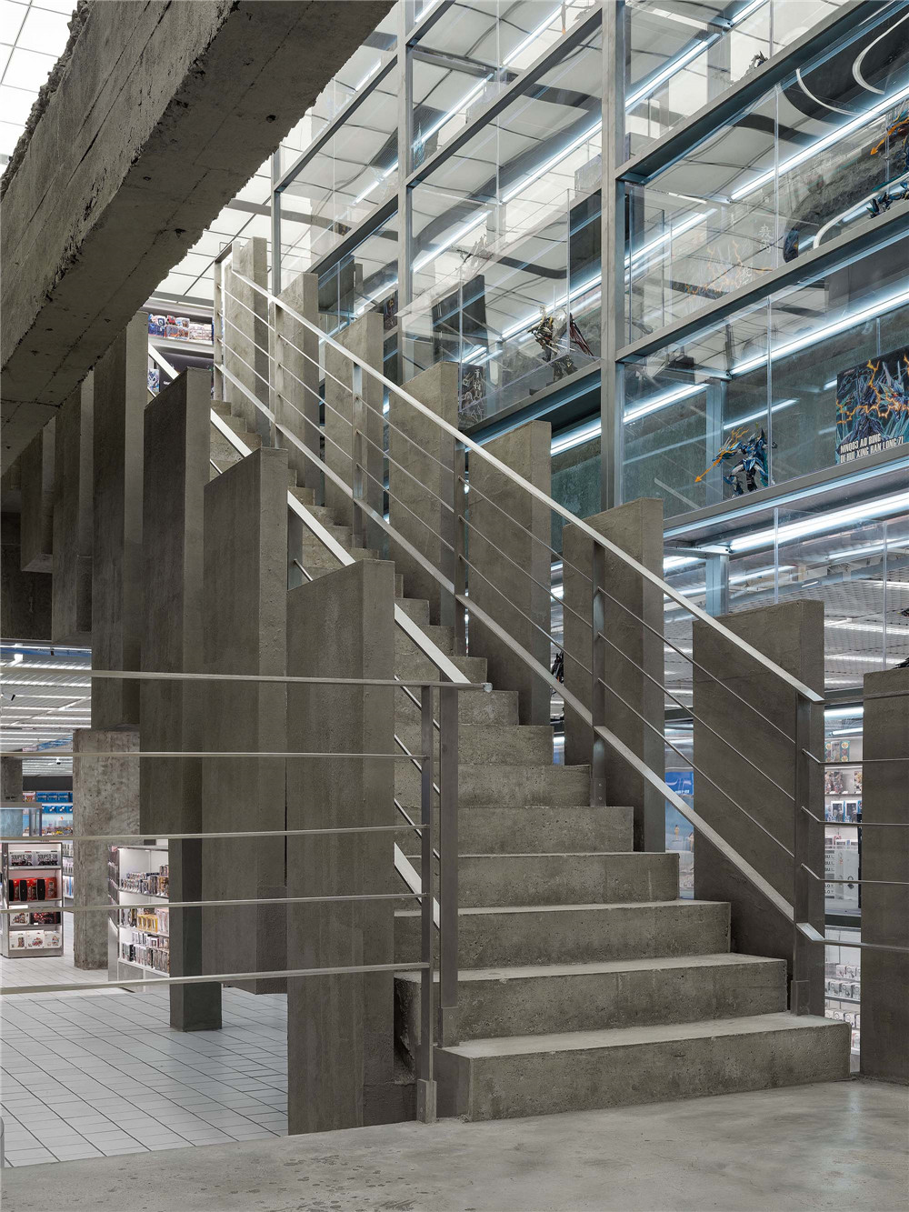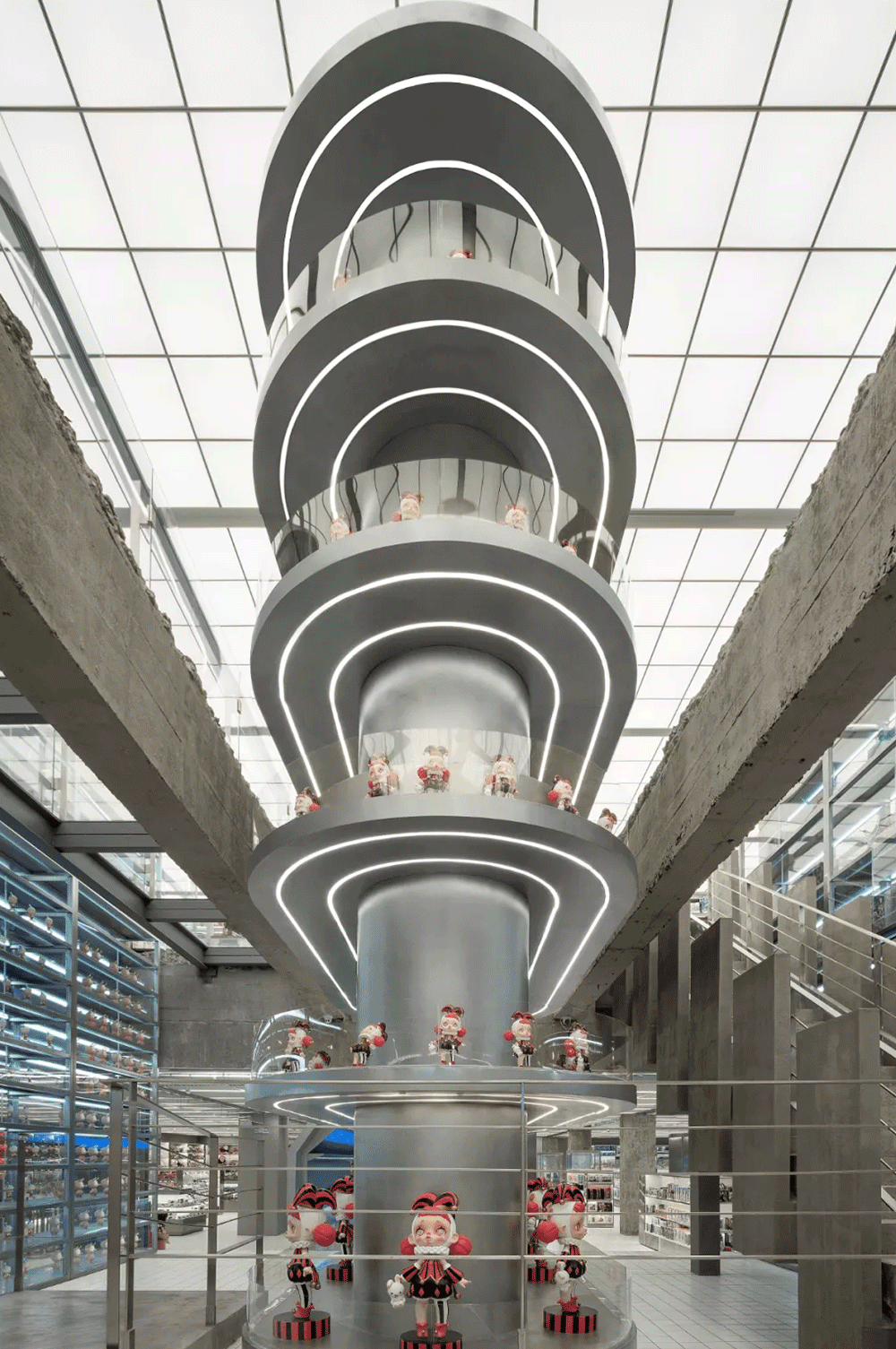 最出彩的设计,是拆除了原来二层的楼板后被“暴露”的混凝土横梁,与极具现代感的拉丝不锈钢、玻璃等材质混合在一起,反差极大。看似粗糙的“减法”设计,其实才是提升潮玩艺术氛围和空间质感的不二法门。