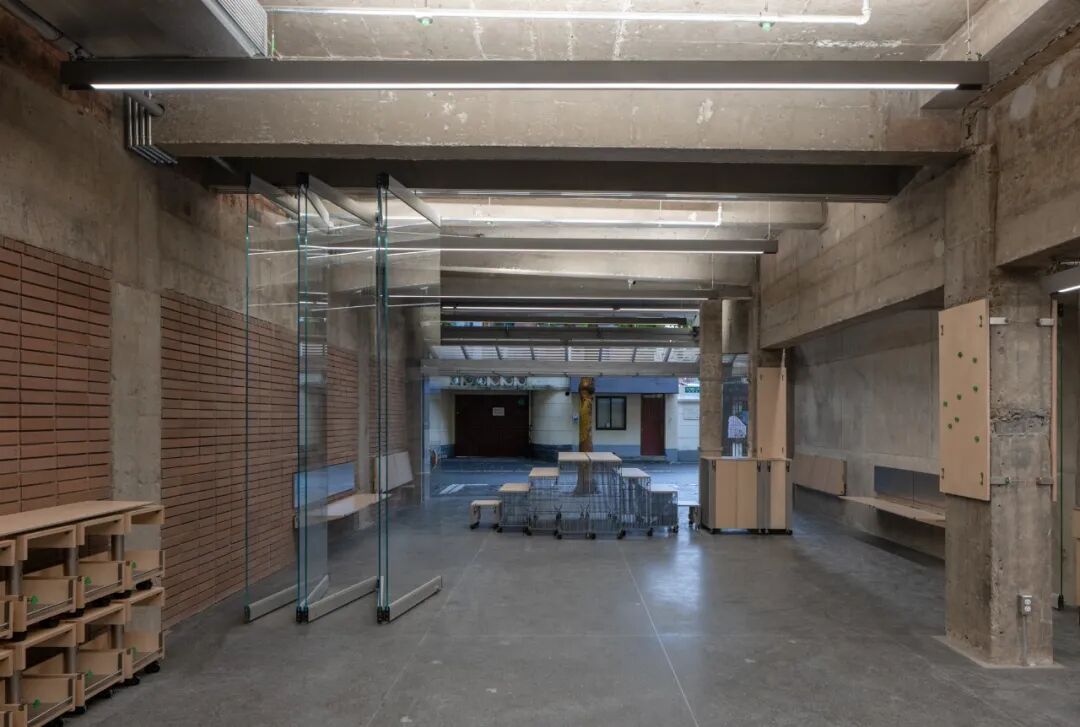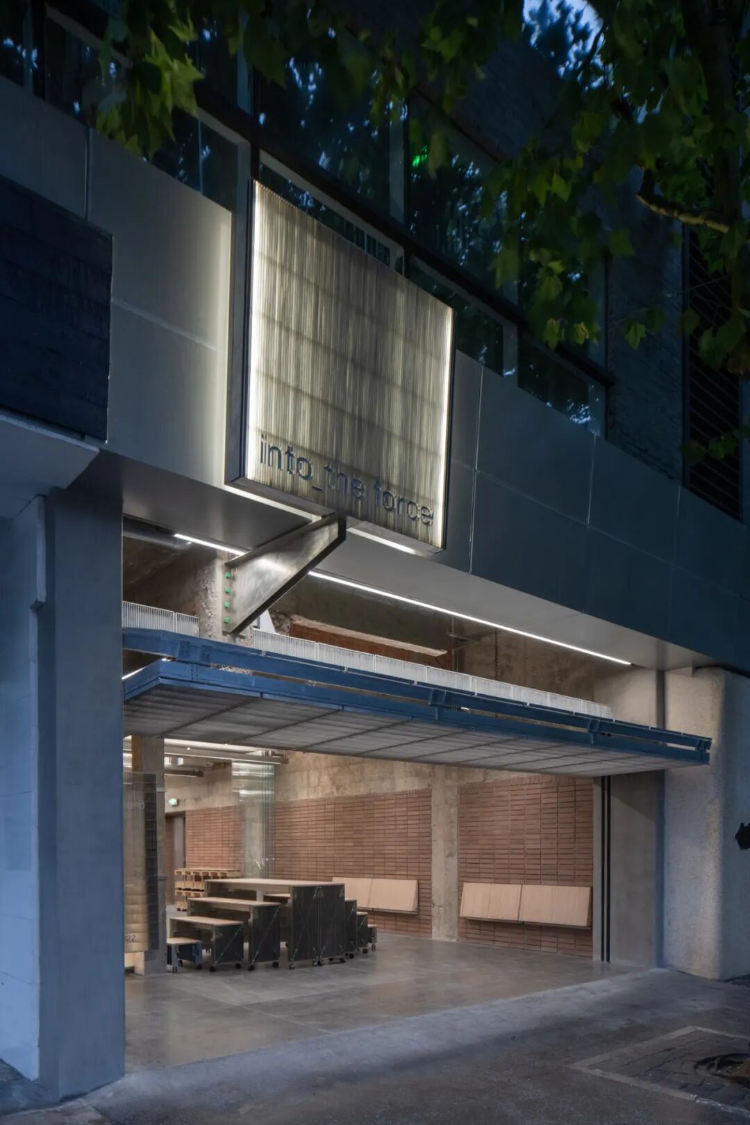 门店立面装有一面巨大的折叠格栅,用来分隔空间的其实内侧的玻璃门,这样做可以最大限度的打开空间,形成一处“退让”的灰空间。